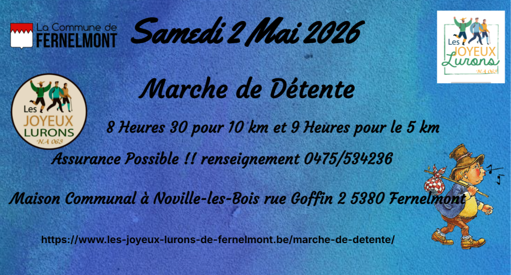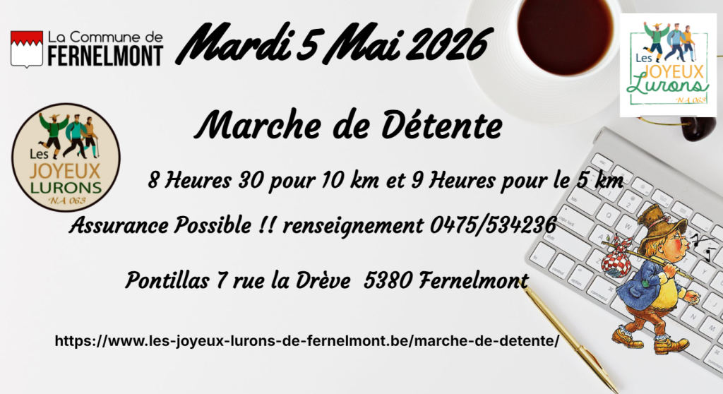 Nos marches en 2026 Le Mardi 28 Avril – Quatrième marche de Détente. Le Samedi 2 Mai- Cinquième marche de Détente. Le mardi 21 juillet – Marche des Caracoles